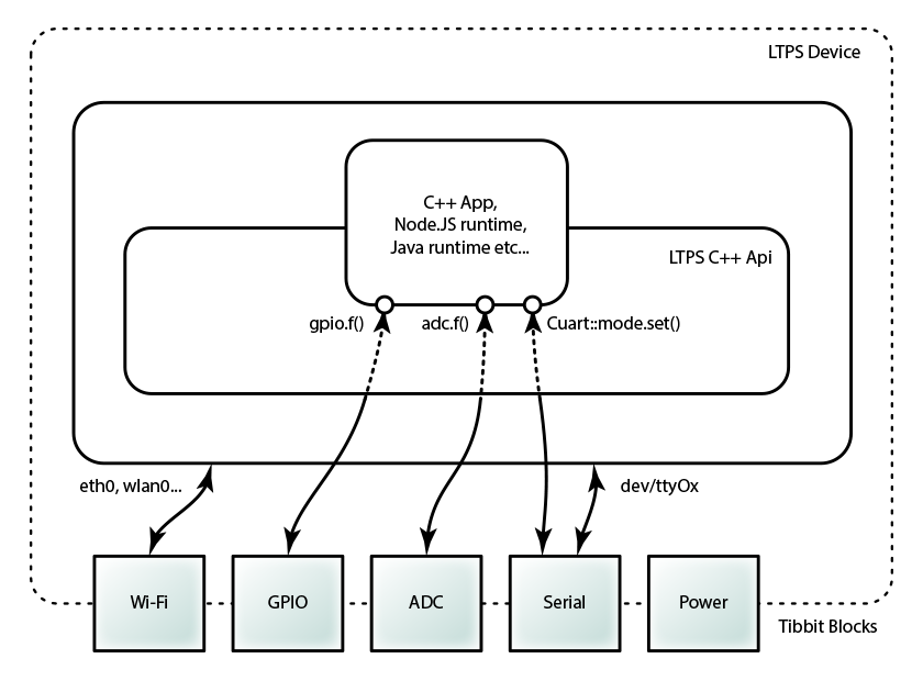 Finally, some other Tibbits (such as a Wiegand, ADC, or a temperature sensor Tibbit) provide I/O functionality or implement hardware protocols that the developer needs to access directly. Such Tibbits are supported by our C++ API. The API contains access and management functions for these Tibbits and some (very minimal) subset of OS interfaces. LTPS C++ API is included into: