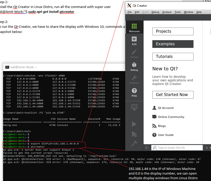 To run the Qt-Creator, we have to share the display with Windows 10, commands are shared in the snapshot below: