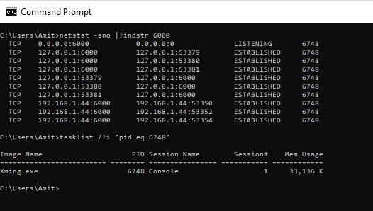 XMing Server is listening by default on port 6000. To find XMing Server process ID, in a DOS command line (run as administrator), please check the snapshot below for commands.