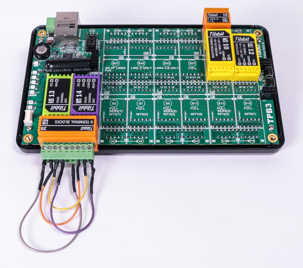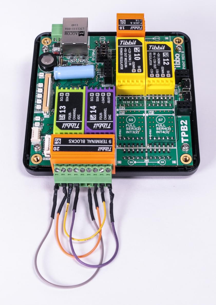 Pictures below illustrate the test arrangement. Notice the wires on the terminal block Tibbit. They interconnect ADC and DAC channels.