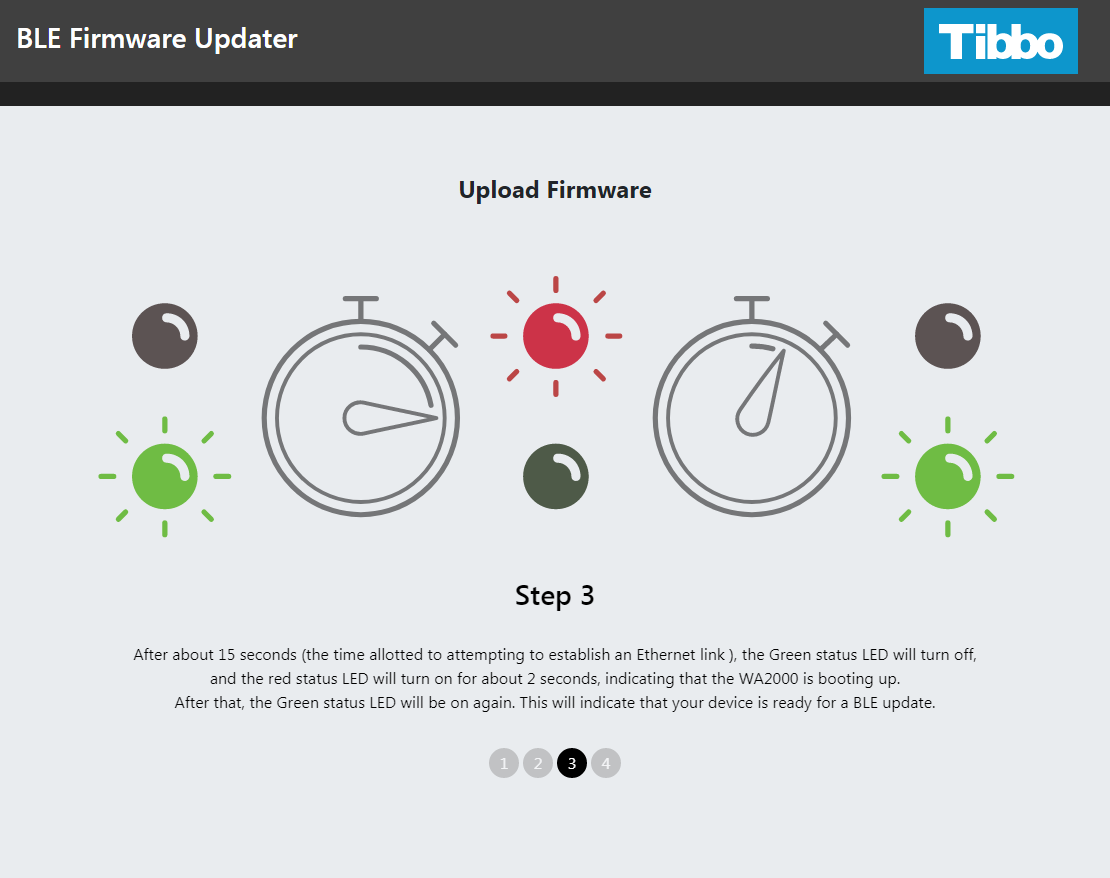 BLE firmware updates can be performed from the Tibbo Updater app (available for iOS and Android).