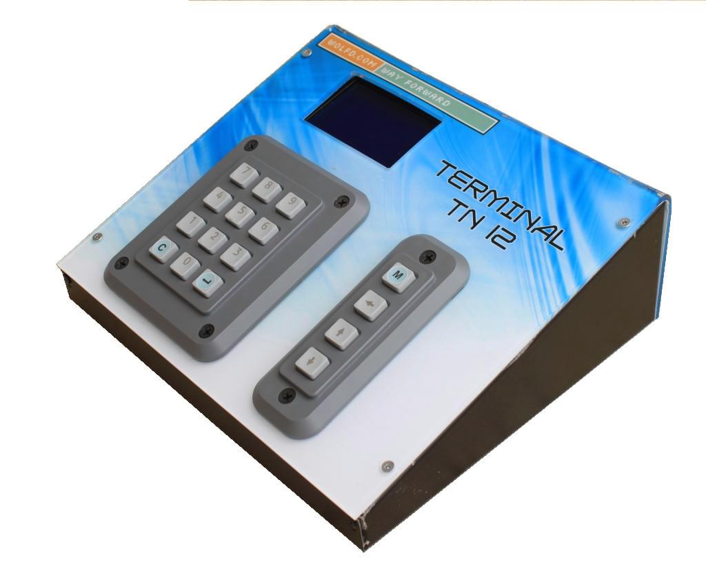A dumb Ethernet data input terminal with a serial printer server, for selecting and printing labels on a production line. All the software runs on a server and the terminal is only used to display and ask for user information, and then the label is sent through a serial port to the label printer. The terminal itself is splash- and vandal-proof.
