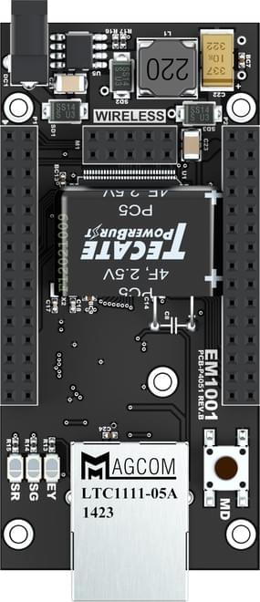 The board is self-sufficient — it does not require a host PCB to plug into. The RJ45 jack is mounted directly on the board. The EM1001 also contains a DC-DC regulator that can power the board and has an additional current budget for external hardware.