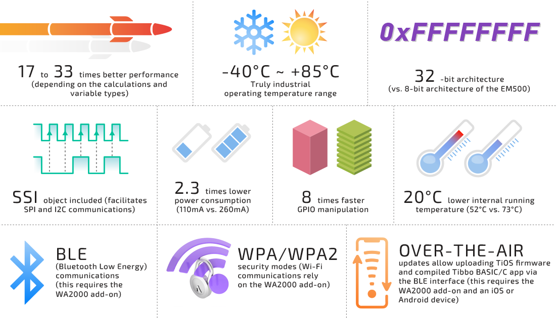 The EM510 is an ultra-compact Tibbo BASIC/C-programmable IoT Module with a single UART, Ethernet, and optional Wi-Fi/BLE* (Bluetooth Low Energy) connectivity. The module offers substantial performance improvements over its predecessor — the original EM500 device.