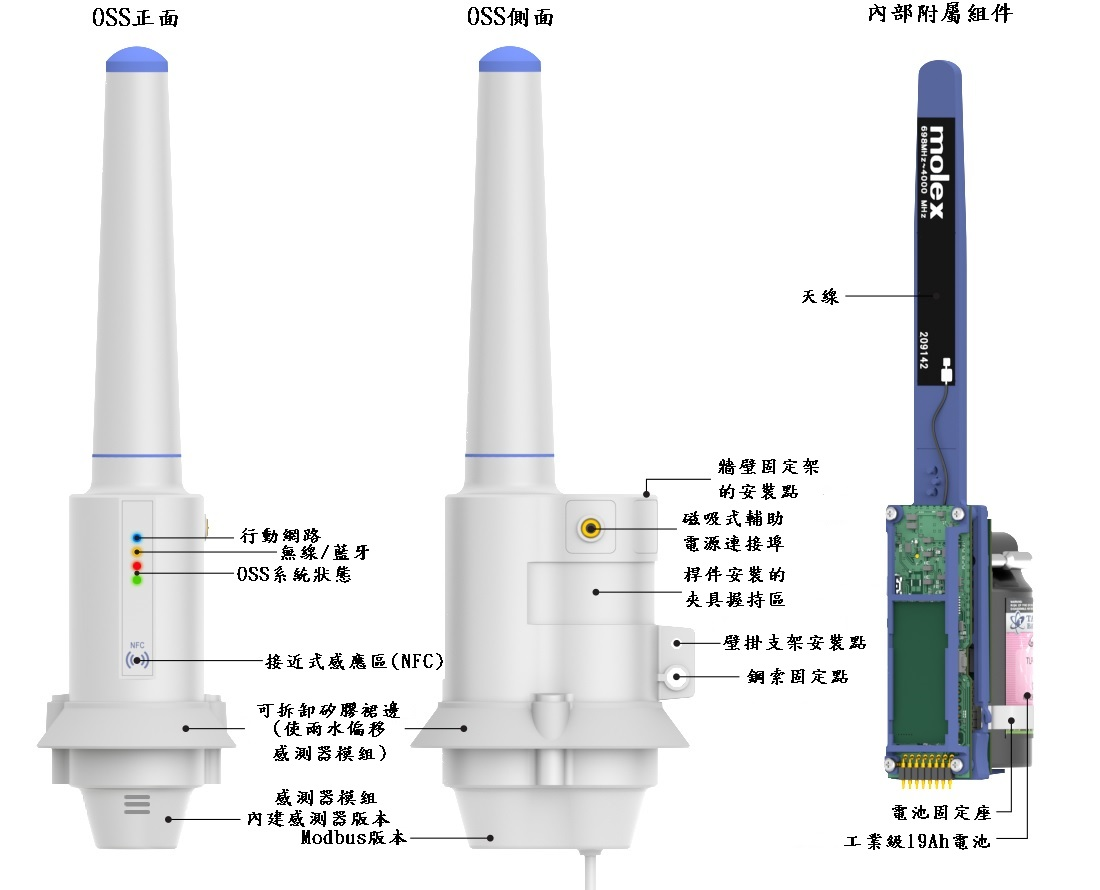 此外,電力也可以通過防鼠電纜從裝置側邊外部提供。OSS 裝置可以選擇配備內建電池、外部電源供電或兩 者兼具。