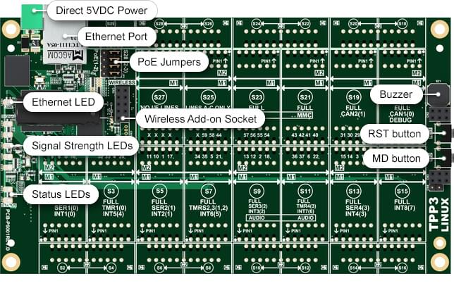 The LTPP3 is a Linux-based Tibbo Project PCB belonging to the Tibbo Project System (TPS) platform. The board is based on a powerful 1GHz Cortex-A8 Sitara CPU and has five UARTs, as well as two CAN controllers.