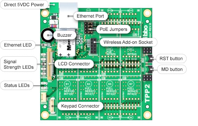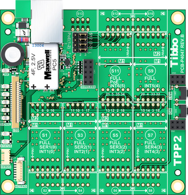 Offering 3 tiles for a total of 6 Tibbit module and 6 Tibbit connector sockets, the TPP2 can be used to create TPS configurations with up to four serial ports, up to 12 relays, or up to 24 control lines, such as opto-inputs, PWMs, or open-collector outputs.